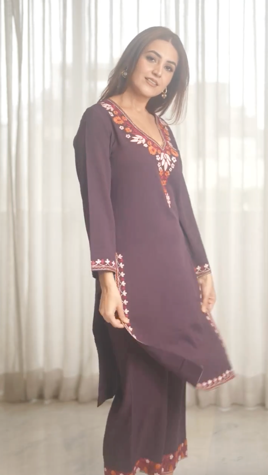 Embrace the rich cultural heritage of Kashmir with this stunning Kurta set, exquisitely adorned with traditional Aari work. Crafted from premium fabric, the vibrant saffron hue radiates warmth and elegance, making it a perfect choice for special occasions. The intricate Aari embroidery, renowned for its fine craftsmanship, adds a touch of regal charm, with delicate motifs that reflect the beauty of Kashmiri artistry. This dress is a true embodiment of luxury and tradition, offering a timeless style that is both captivating and unique.